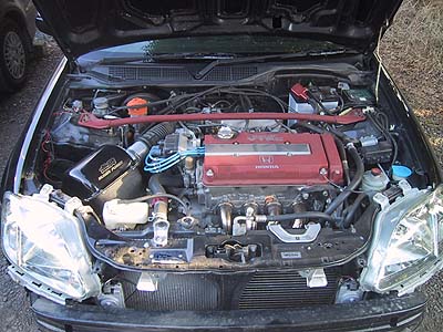 自慢の心臓、B16Bが載っています。ブルーのコードは前のオーナーがつけていたNGKのパワーケーブル。無限のオイルフィラーキャップがお気に入り。 右の画像は最近のものです。無限のエアクリが装着されています。 無限信者になりつつあります。(もうなってる?)